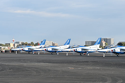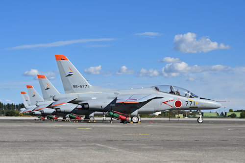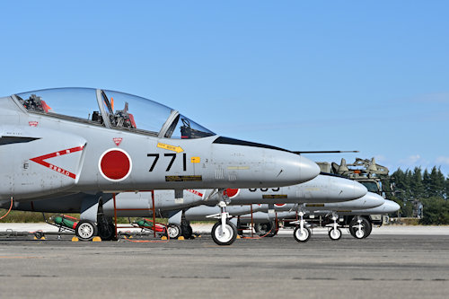 列線の撮影では立ち位置と視線の高さで写真の印象が大きく変わってきます。頑張ってみたのですがT-4は脚の長さが短いようで奥に並ぶ機体が手前の機体に隠されてしまいます。