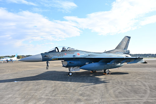 百里基地から飛来した第3飛行隊のF-2戦闘機。事前告知では小松基地の第306飛行隊のF-15も参加予定でしたが当日になっても飛来せず、キャンセルになった模様ですが理由は明らかにされていません。入間ではブルーインパルスを目的に来る観客も多く、ファイター系の成分は控えめにしていくのかもしれません。戦闘機に興味を持った人は黙っていても小松、百里に行くだろうと…。