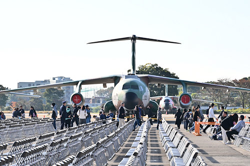 会場南側の端に設けられた招待エリアにはパイプ椅子が敷かれており、その奥には今年3月に退役したばかりのC-1輸送機の姿がありました。さらにその後ろには退役記念塗装機の姿もありました。展示ではなくスペースの都合上追いやられてしまったと考えるのが正しそうです。