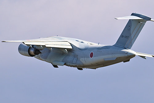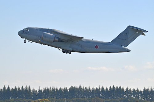 U-4に続いて第402飛行隊のC-2輸送機が離陸 しました。この時点で滑走路を向く方角は逆光気味の条件でした。滑走を挟んだ反対側に新たに設けられたランウェイビューエリアからはうまく巡光で撮れたのでしょうか。