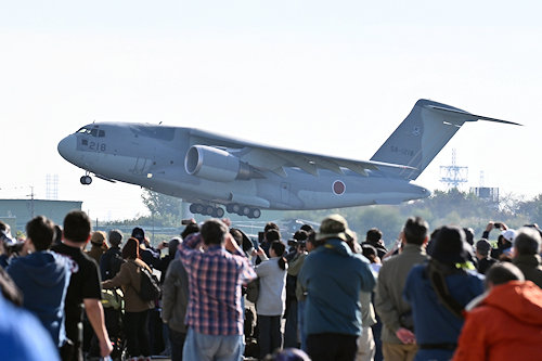 輸送機とは思えないほどの勢いで行うコンバットピッチを先代C-1輸送機から引き継がれた伝統の技です。航空祭の開催時間短縮のために各機は分刻みのスケジュールで正確に展示飛行をこなしました。これで地元入間基地に所属する飛行隊の展示飛行が全て終わりました。
