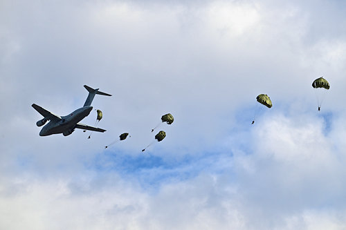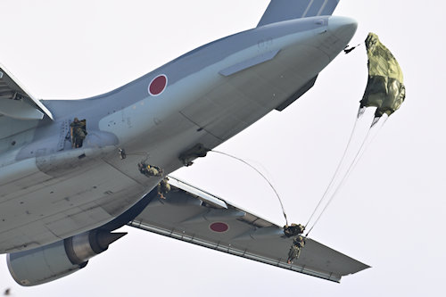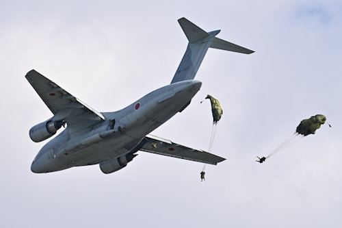 次々と 降下する第一空挺団。よく言われる有名な例え話では高度300mを時速300kmで飛行するこの空挺降下は東京タワーの高さを通過する新幹線から飛び降りるのと同じだそうです。