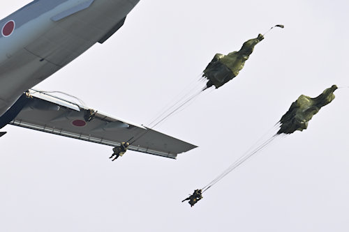 風圧を受けて後方へ流される隊員2名が同じ姿勢で並びました。空挺降下といえば習志野演習場で年初に開催される降下訓練始めが有名です。この10月に小泉進次郎防衛大臣が就任したことにより、来年の降下訓練始めは混雑しそうな予感がします。