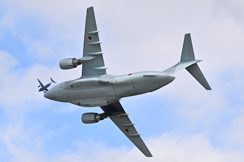 離陸後にランディングギアを収納して高度を上げていくC-2輸送機。この後出番となる9時からのオープニングフライトに向けて時間調整のためホールディングポイントへと向かいます。