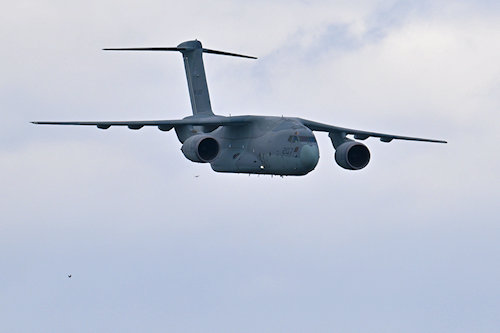 上空にC-2の二番機が進入してきました。フラップを下げて低速度での飛行を維持していることが伝わってきます。