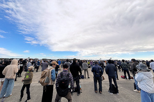 2番機が離陸しました。ご覧のように滑走路に近い場所は多くの人が写真におさめたり、一目見ようとしたり前の方へ詰め掛けています。もっとも望遠レンズを構えたカメラマンは後方に集まりますが。