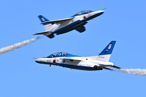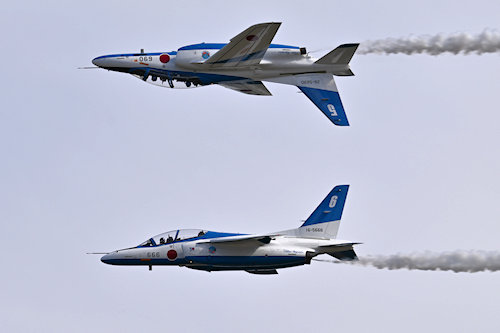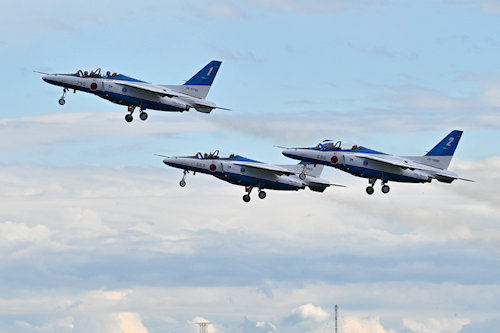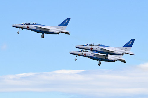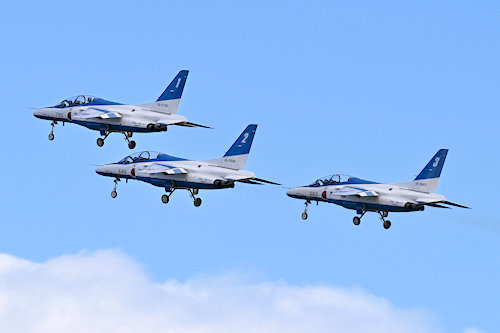 10時39分から49分の10分間は T-4×3機による展示飛行が行われます。先行の2機はフォーメーションテイクオフで通常アングルで離陸しました。