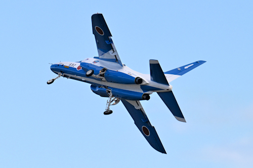 ロールを打つ6番機。通常の機体であれば展示飛行といえども背面飛行を行うことは禁止されており、特別な訓練を重ねて許可を持っているブルーインパルスしかこのような機動飛行は行えません。