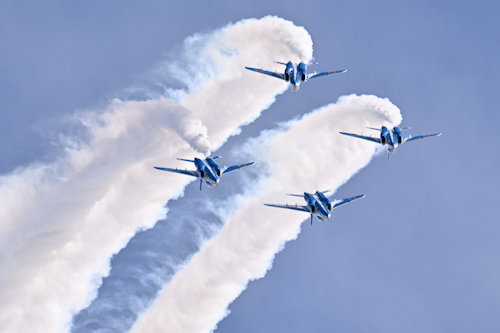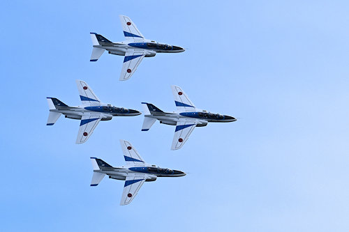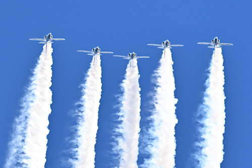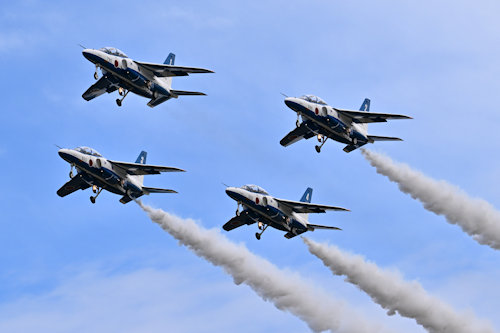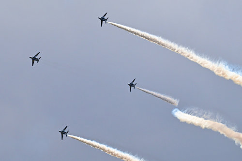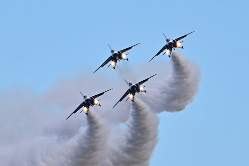 頭上を通過する頃にはスモークをカットします。4機のダイアモンド編隊をクリーンな状態で至近距離から撮影できます。