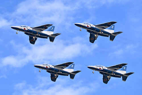 ダーティーターン&ローパスで観客の頭上を通過するブルーインパルスの4機編隊。ショーの序盤でいきなりファンの心を掴む挨拶代わりの課目です。