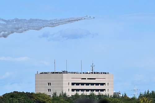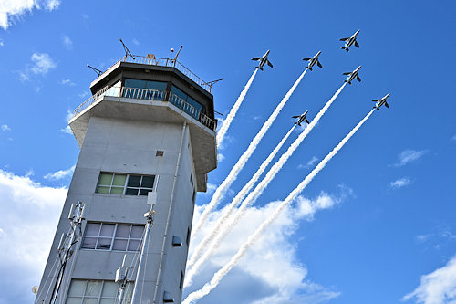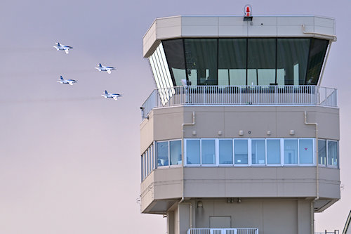 ファンブレイクを披露した後、新しい管制塔を取り巻くように離脱していく4機編隊 。