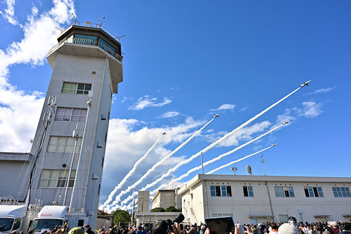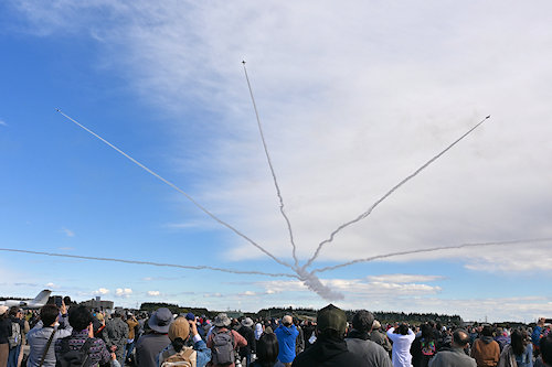 ブルーインパルス伝統の課目であるローリング・コンパクト・ピッチです。ブルーインパルスの展示飛行が終了する頃には帰りの電車の混雑を避けるために一足早く駅へと向かう人の姿もちらほら見えました。今回の午前開催のスケジュールは20万人が集まる過密な入間基地航空祭において帰りの混雑を緩和しつつ、終了時刻に余裕をもたせて開催の負担を軽減することに有効だと思いました。