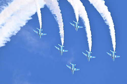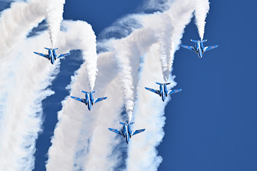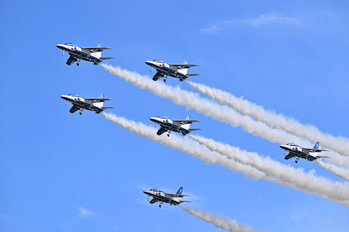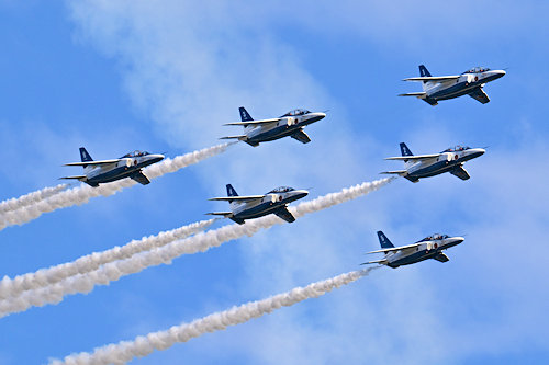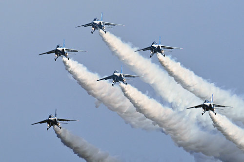 ショー後半となり6機編隊による課目へと移ります。デルタ隊形で進入するブルーインパルスのエアインテークが白く輝きました 。