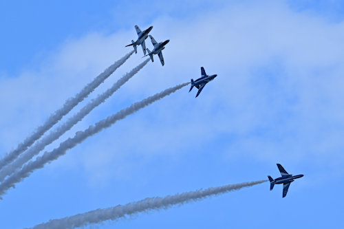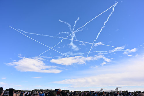 上空で4機の集合を終えたブルーインパルスはランディングライトを点灯したままフォーメーションを組んで会場上空へと進入してきます。低速飛行時はスモークが太くなるので画面内の余白スペースが少なくなります。